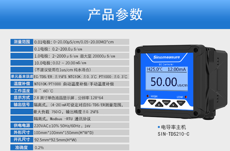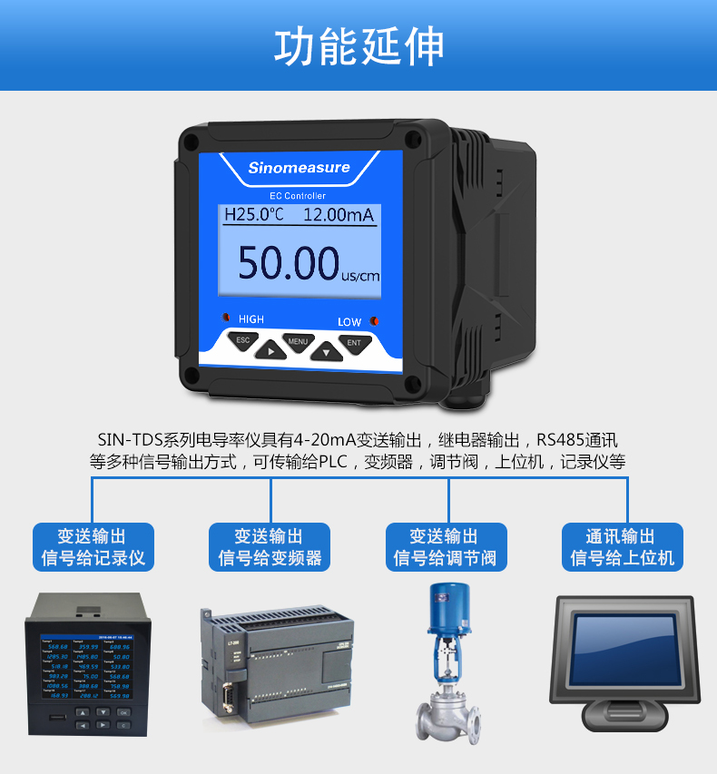 聯測儀表SIN-TDS210-C工業電導率儀表,廣泛應用于火電、化工化肥、冶金、環保、制藥、生 化、食品和自來水等行業。控制器主要對溶液中的電導率/總溶解固體/ 電阻率和溫度進行連續監測。