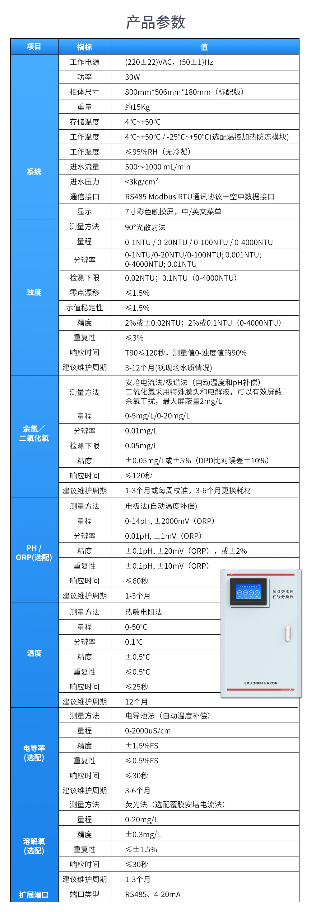 多參數(shù)水質(zhì)在線分析儀是本公司自主研發(fā)制造的新一代飲用水水質(zhì)監(jiān)測(cè)設(shè)備,該設(shè)備可廣泛用于城市或村鎮(zhèn)自來(lái)水廠、自來(lái)水輸水管網(wǎng)、自來(lái)水二次供水、用戶末梢、室內(nèi)游泳池、大型凈水設(shè)備和直飲水等水質(zhì)在線監(jiān)測(cè),是水廠生產(chǎn)過(guò)程控制、水利水務(wù)管理、衛(wèi)生監(jiān)督等領(lǐng)域必不可少的在線分析設(shè)備。